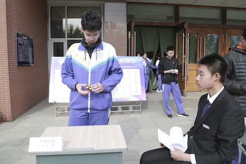 数学来源于生活,又服务于生活,数学和生活密切相关,附中的学生是应该是德才兼备,全面发展的优秀学子,不仅学习优秀,更要适应社会的发展,能学以致用,团结协作。为了培养学生学习数学的兴趣,激起学生数学爱好,丰富学生的校园生活,本次科技节中举办了:“智力大比拼-------第一届魔方大赛”活动。