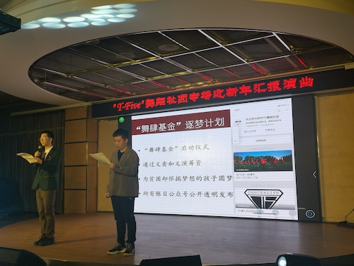 T5社团致力于将学生的学业、特长与时代潮流文化相结合,借助舞蹈这一媒介培养学生综合素质。锻炼他们克服困难、勇于挑战的意志品质,并将这种能力迁移到学习生活中,在未来的人生道路上勇于担当勇往直前。演出现场气氛持续升温,由我社同学共同组织策划的 “舞肆基金”启动仪式正式开始。本基金意在帮助那些生活困难却怀揣梦想的孩子。我社同学将利用义卖(社刊)和义演的收入,给孤儿院和贫困的孩子捐款,送去希望。启动仪式有请现场所有观众关注我社的公众号,基金流向将全部以公开透明的方式在公众号上发布。