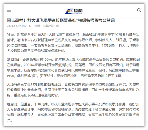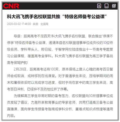 人民网、中国新闻在线、央广网、教育新闻网、北国网、吉林资讯广播等官方媒体专门报道了本次“名师备考公益课”活动。科大讯飞智慧教育公众号、智学网家长圈等公众号发文多篇,并通过朋友圈海报、名师分享等形式在家长和学生间广泛传播,得到了社会的普遍好评。