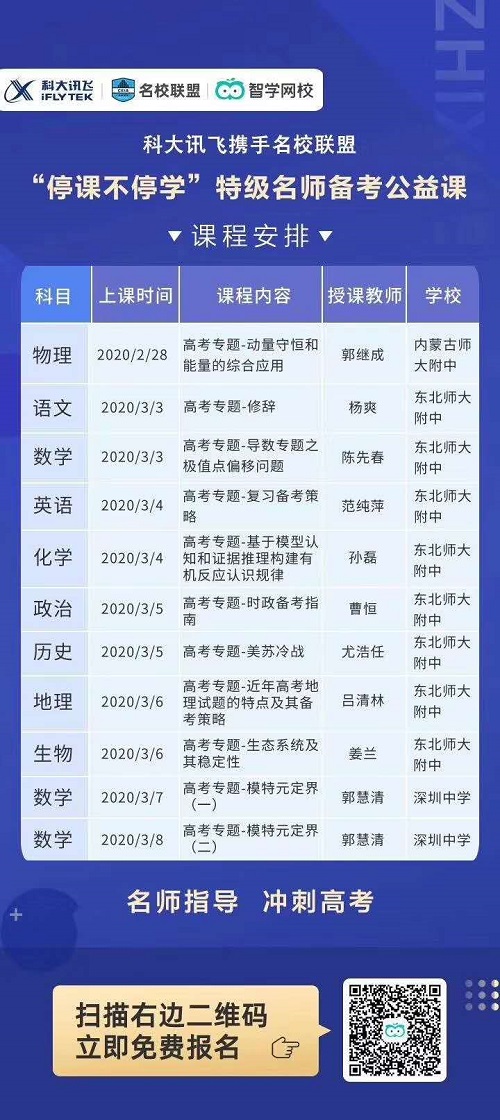 本次公益课携手“名校联盟”,利用“科大讯飞”的网络平台,共推出覆盖高考所有学科共11堂精品课程。主管教学工作的张晓娟校长、高三年级徐微主任和各学科组从2月20日即开始筹备,至3月8日晚所有课程直播圆满完成。