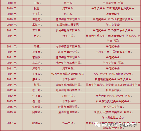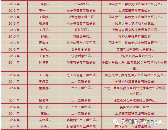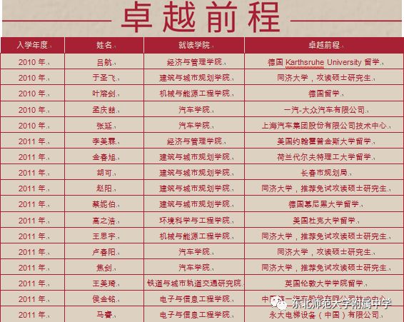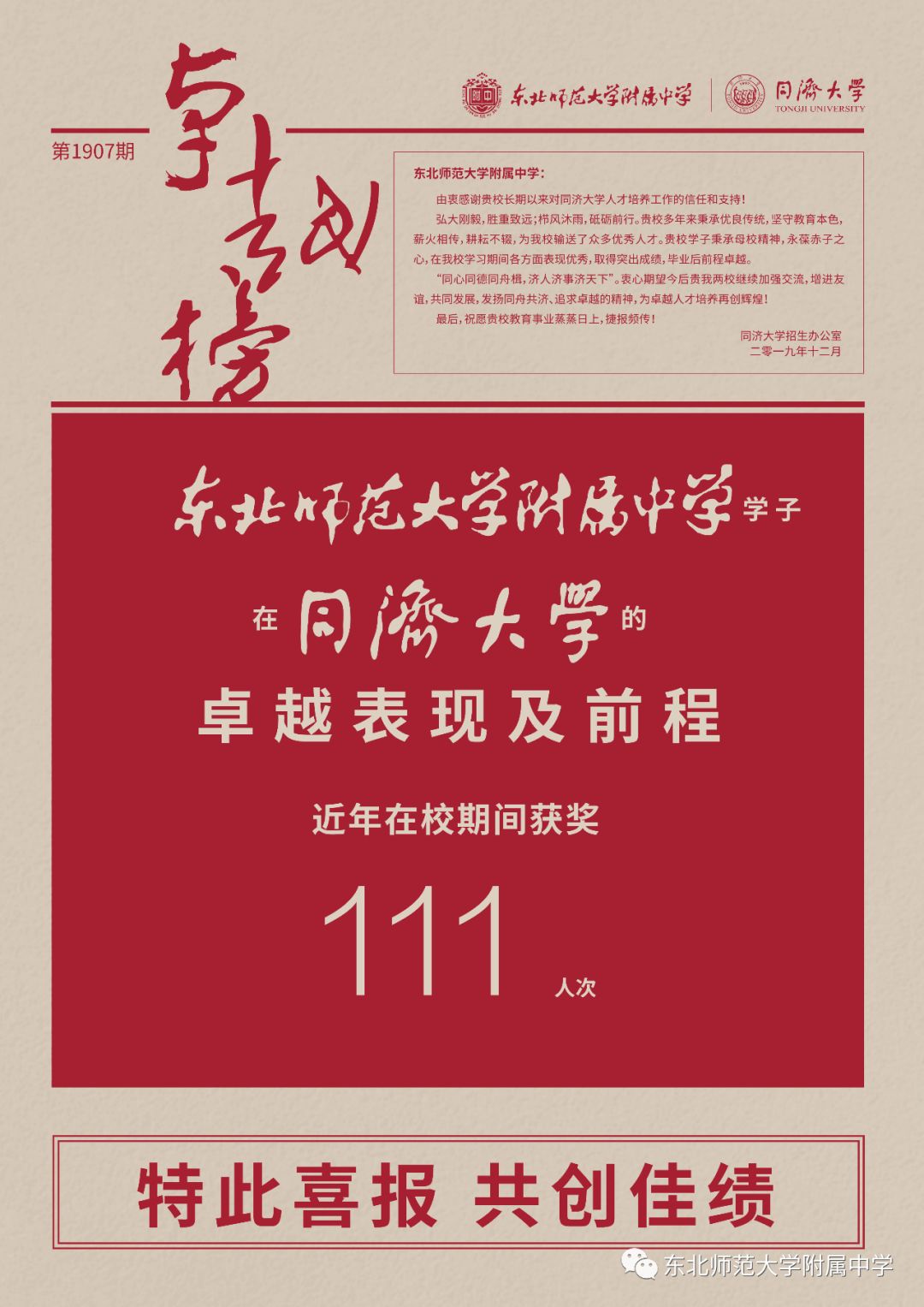 值此东北师大附中建校70周年之际,同济大学向我校发来喜报,近年我校毕业生共有111人在同济大学求学期间荣获各种奖励荣誉、取得卓越成就,这是两校在基础学科拔尖创新人才衔接培养方面取得的又一硕果。十年来附中向同济大学输送附中优秀毕业生218名、向国内985以上高校输送附中优秀毕业生人数达到8067名!母校希望所有附中校友坚持理想、追求卓越,更希望大家在中华民族伟大复兴征程中做出卓越贡献!