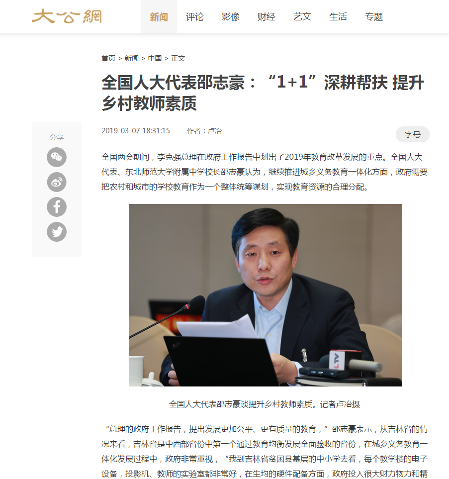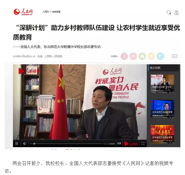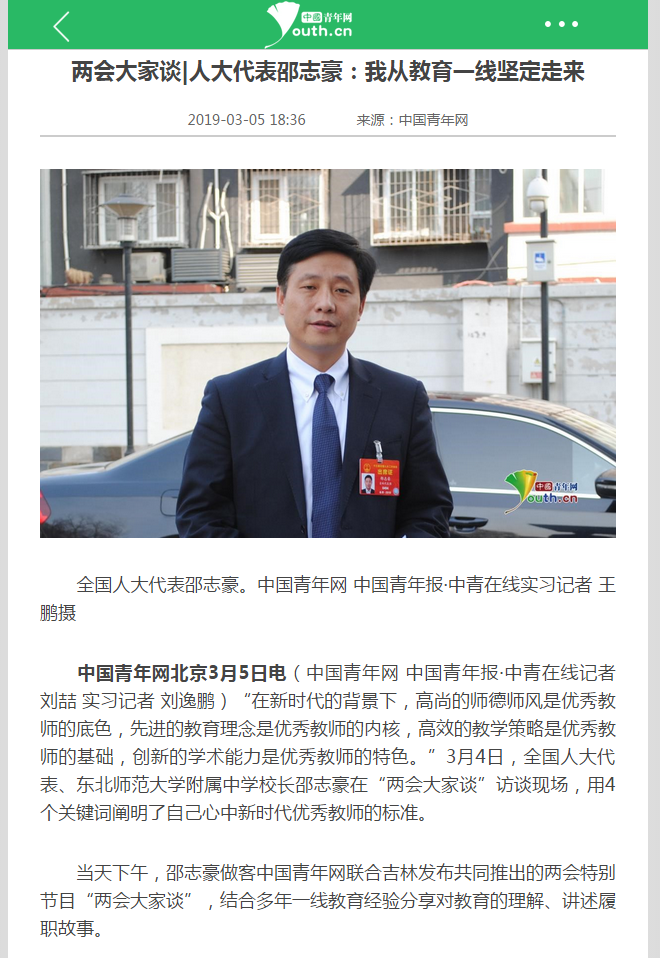 在北京参加两会的全国人大代表、东北师大附中校长邵志豪,在会议休息期间陆续接受了多家国内重要媒体的采访,中央电视台、《人民日报》、《光明日报》、《人民网》、《大公网》、《中国青年网》、《教育部新媒体两会特刊》、《吉林日报》等国内各大媒体纷纷以大篇幅进行报道。邵志豪校长针对教育中的各类问题侃侃而谈,有理论,有高度,有前瞻性,充分体现出一个人大代表的使命和担当,彰显了东北师大附中的形象,这是全体东北师大附中人的骄傲!