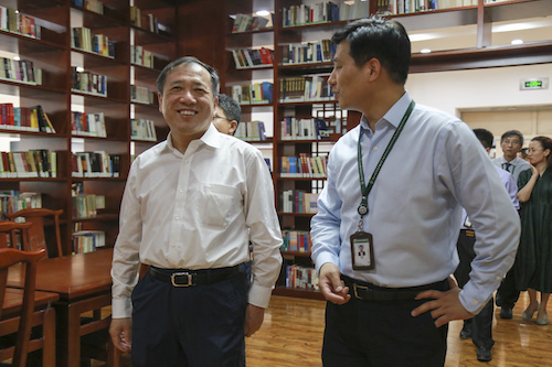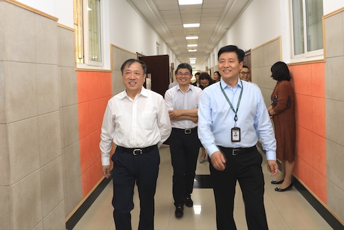 杨书记一行在我校领导班子的陪同下,参观了体育艺术中心和图书馆,我校邵校长向客人们介绍了学校文化建设和课程体系建设的成果,杨书记对东北师大附中给予了高度评价。