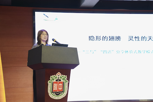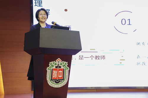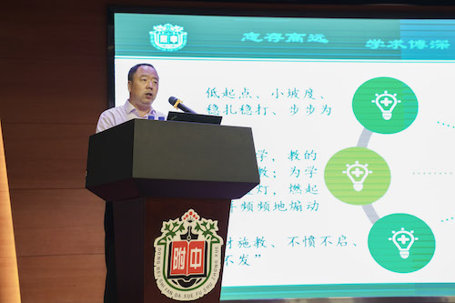 东北师大附中校长邵志豪首先做了会议致辞,他在致辞中倡导学术性成长是教师从教书匠走向教育家的最有效路径,希望教师致力于教学学术,走向未来教育家。会议第二项,由东北师大附中五位名师做学术报告。物理正高级教师卫青山做了题为“智慧课堂“五环”教学模式的建构”的报告,详细的介绍了他在多年教学实践中提炼的智慧课堂“五环”教学模式。地理正高级教师郎云华做了“如何成为一名学术型教师”的报告,详细的阐述了他在30年从教经验基础上总结出来的对于学术型教师内涵和成长路径的理解。生物高级教师高毅做了以“让学生成为学习的主人”的报告,向大家介绍了基于生物学科教学的学生主体性教育思想。语文高级教师唐雪晶以“隐形的翅膀·灵性的天空”为主题,与大家分享了“三与”“四适”分享体验式教学模式。物理正高级教师谭晓春将自己在多年教学中提炼的“本源教学”思想系统的介绍给大家。